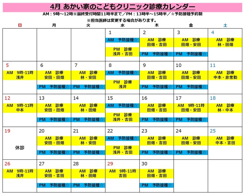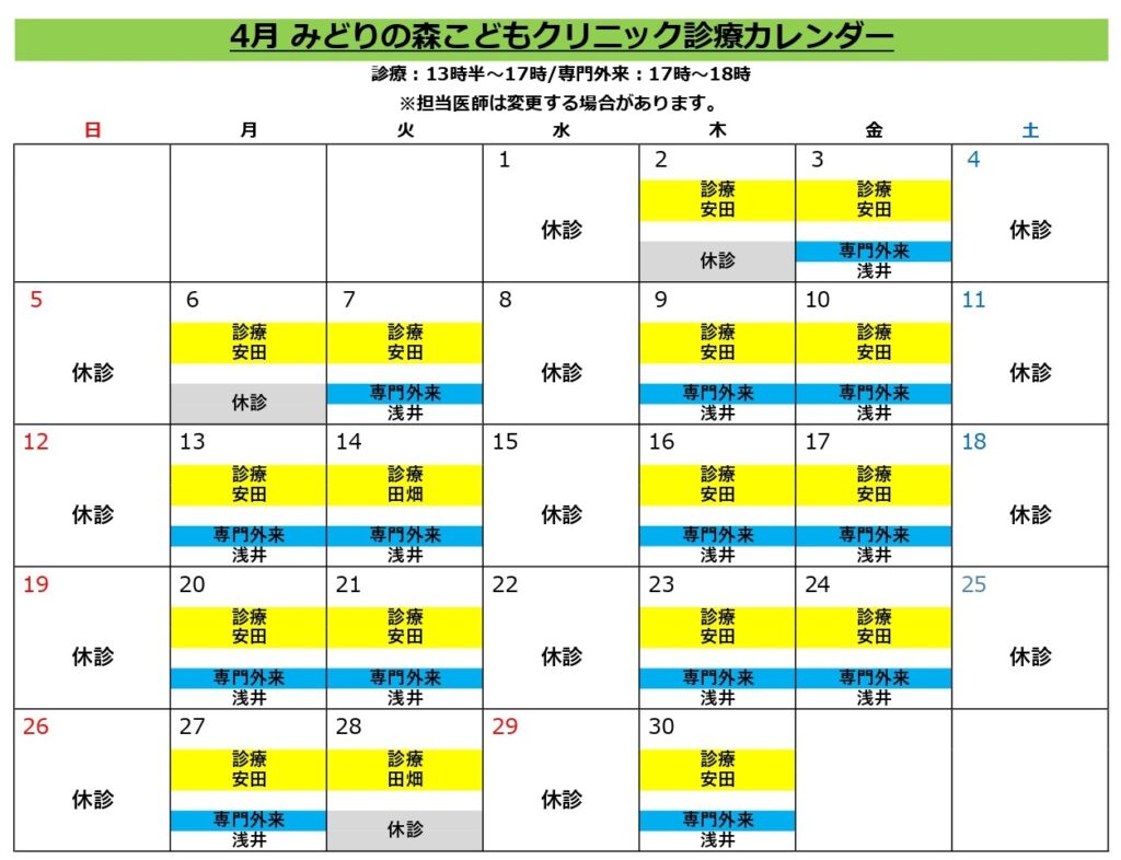 ☆☆4月診療カレンダーと担当医師☆☆