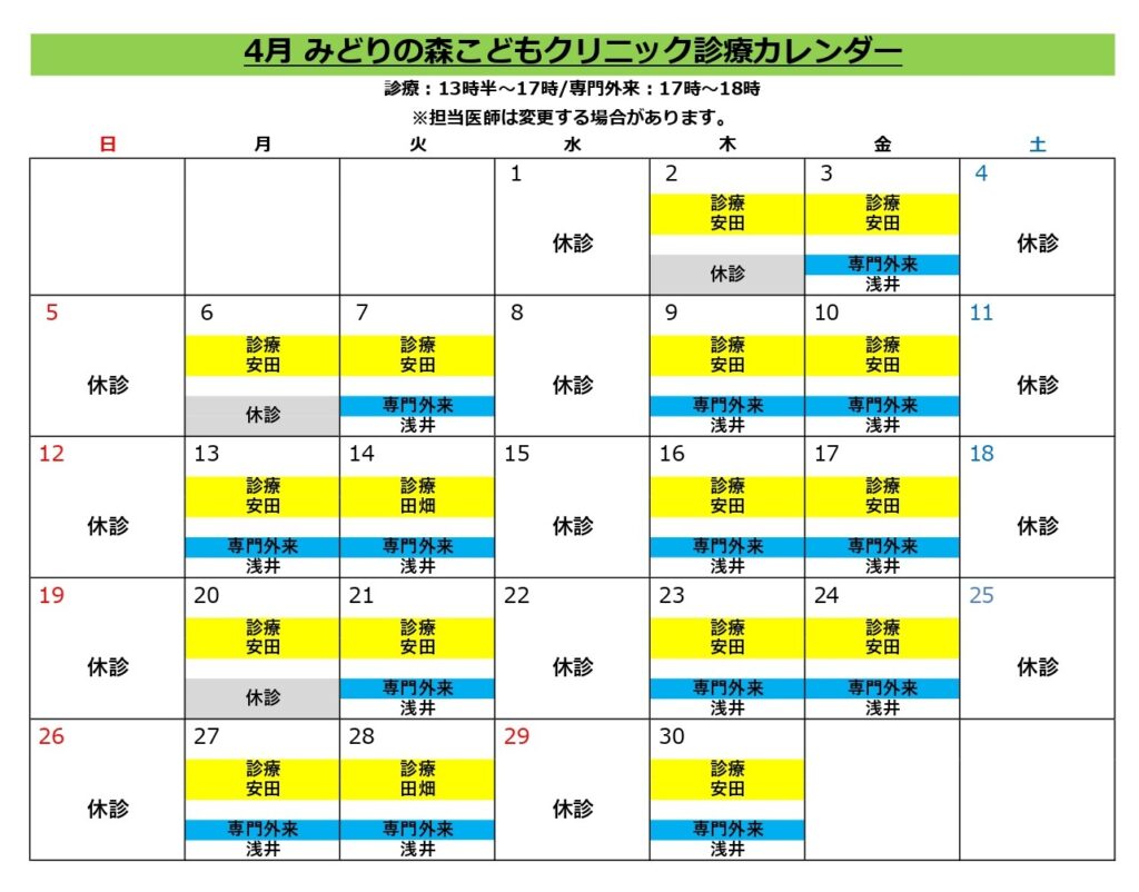4月診療カレンダー&担当医師2026.03.27